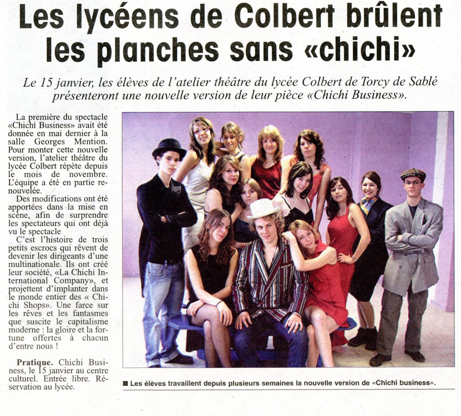 L'atelier-théâtre du lycée Colbert de Torcy a joué "Chichi Business" une première fois, le 24 mai 2007 dans la salle Georges Mention à Sablé-sur-Sarthe et une seconde fois, le 15 janvier 2008 au centre culturel Joël-Le-Theule, toujours à Sablé.